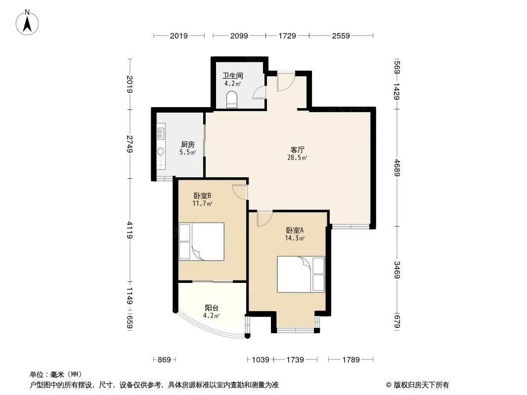 户型齐全,主打明厨,客厅朝南,主卧朝南二居