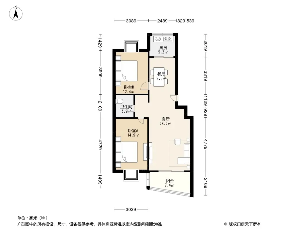 户型齐全,主打户型方正,明厨,明卫,客厅朝南,双阳台三居