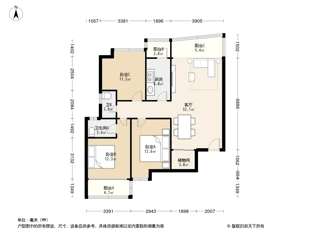 户型齐全,主打明卫,客厅朝南,双卧朝南,主卧朝南三居