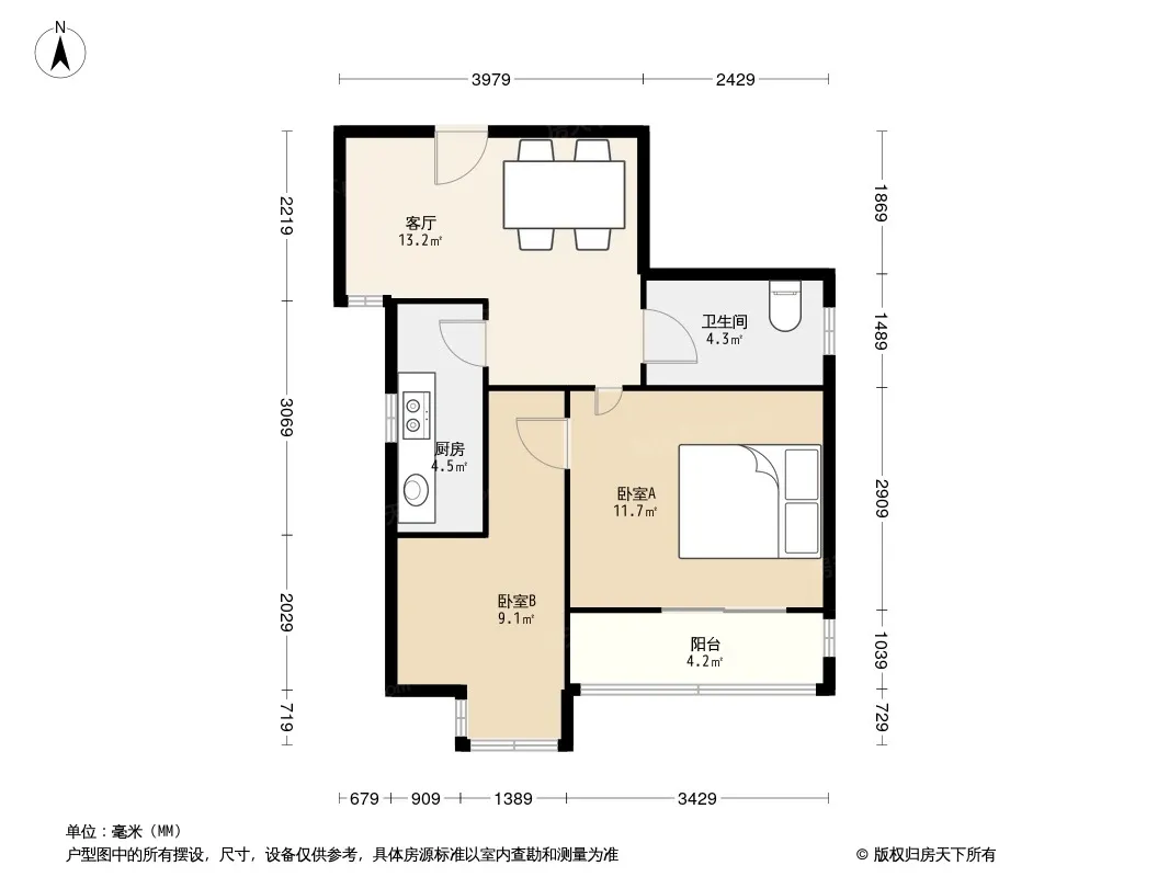 户型齐全,主打明厨,客厅朝南,双卧朝南二居