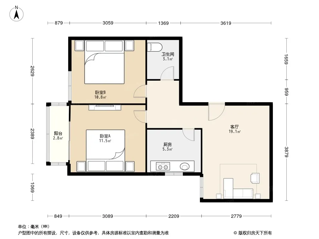 户型齐全,主打明厨,客厅朝南,双卧朝南二居