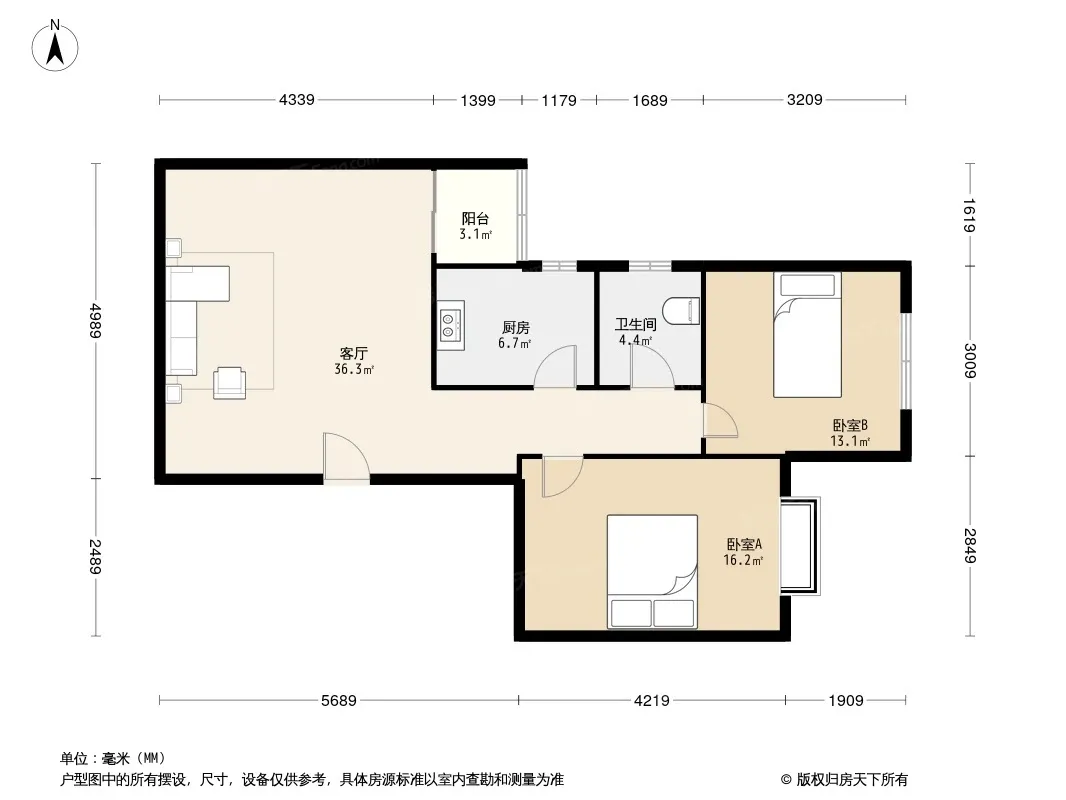 户型齐全,主打明厨,客厅朝南,双卧朝南二居