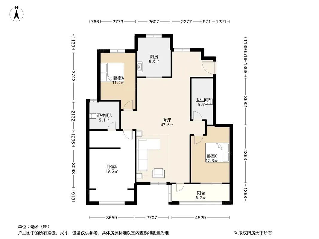 户型齐全,主打户型方正,明卫,明厨,客厅朝南,主卧朝南三居