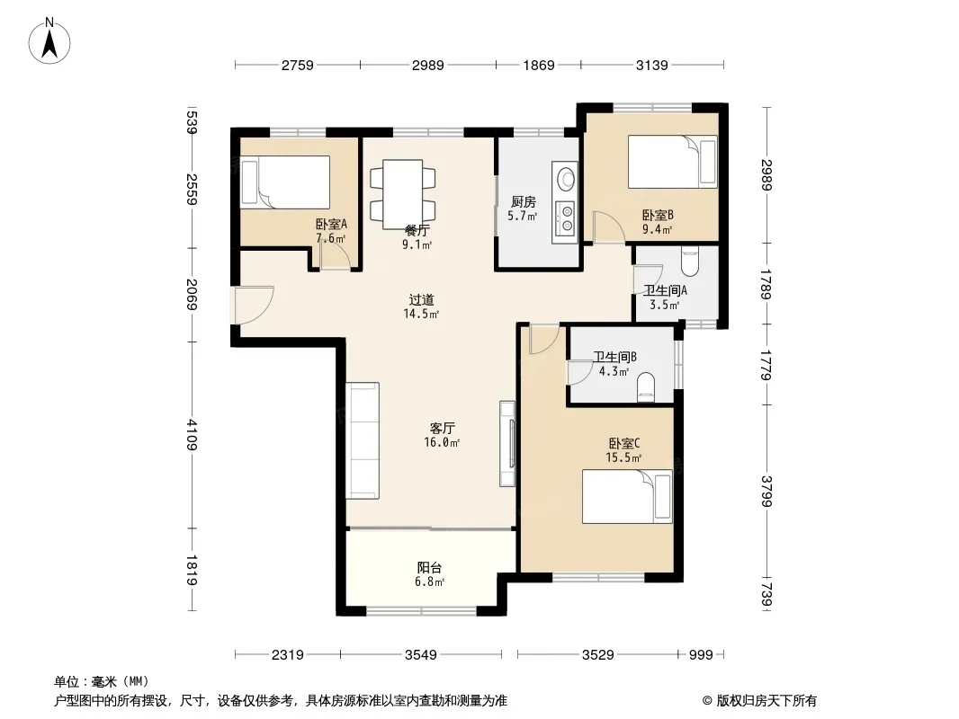 户型齐全,主打南北通透,户型方正,客厅朝南,卧室朝南,双阳台三居