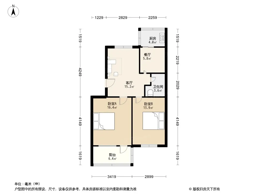 户型齐全,主打户型方正,明厨,客厅朝南,双卧朝南,主卧朝南二居