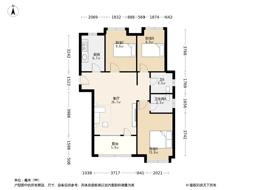 户型齐全,主打户型方正,明卫,明厨,主卧朝南三居