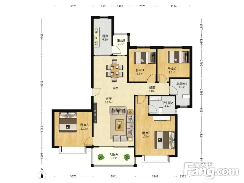 户型齐全,主打户型方正,明厨,明卫,独立衣帽间,双阳台四居