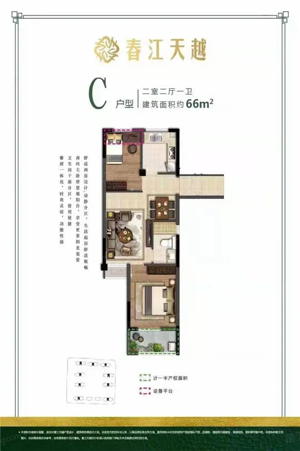 春江天越户型主要有66平-71平的户型方正,客厅朝南,卧室朝南,主卧朝南,明卫的二居 、91平-91平的全明格局,户型方正,卧室朝南,主卧套间的三居 。