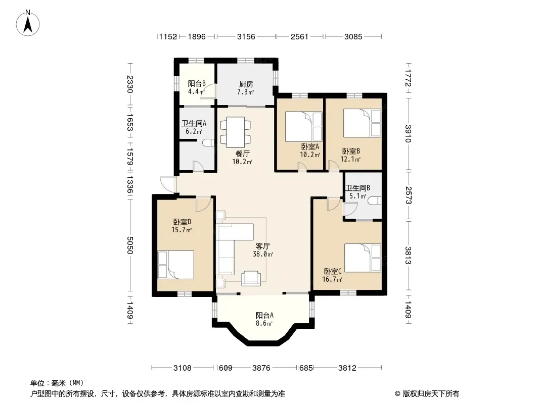 万源小区户型主要有156平-156平的户型方正,明厨,客厅朝南,双阳台,双卧朝南的四居 。