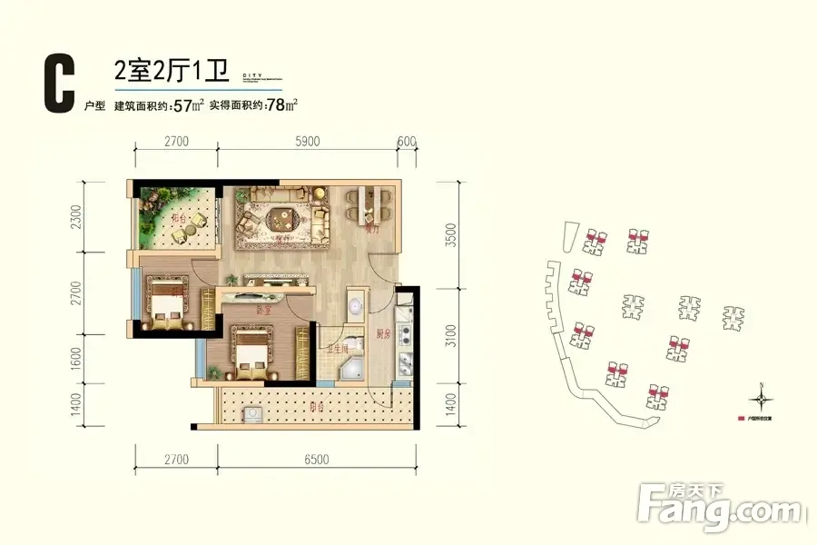 C户型,建筑面积57㎡,实得面积78㎡精装修拎包入住