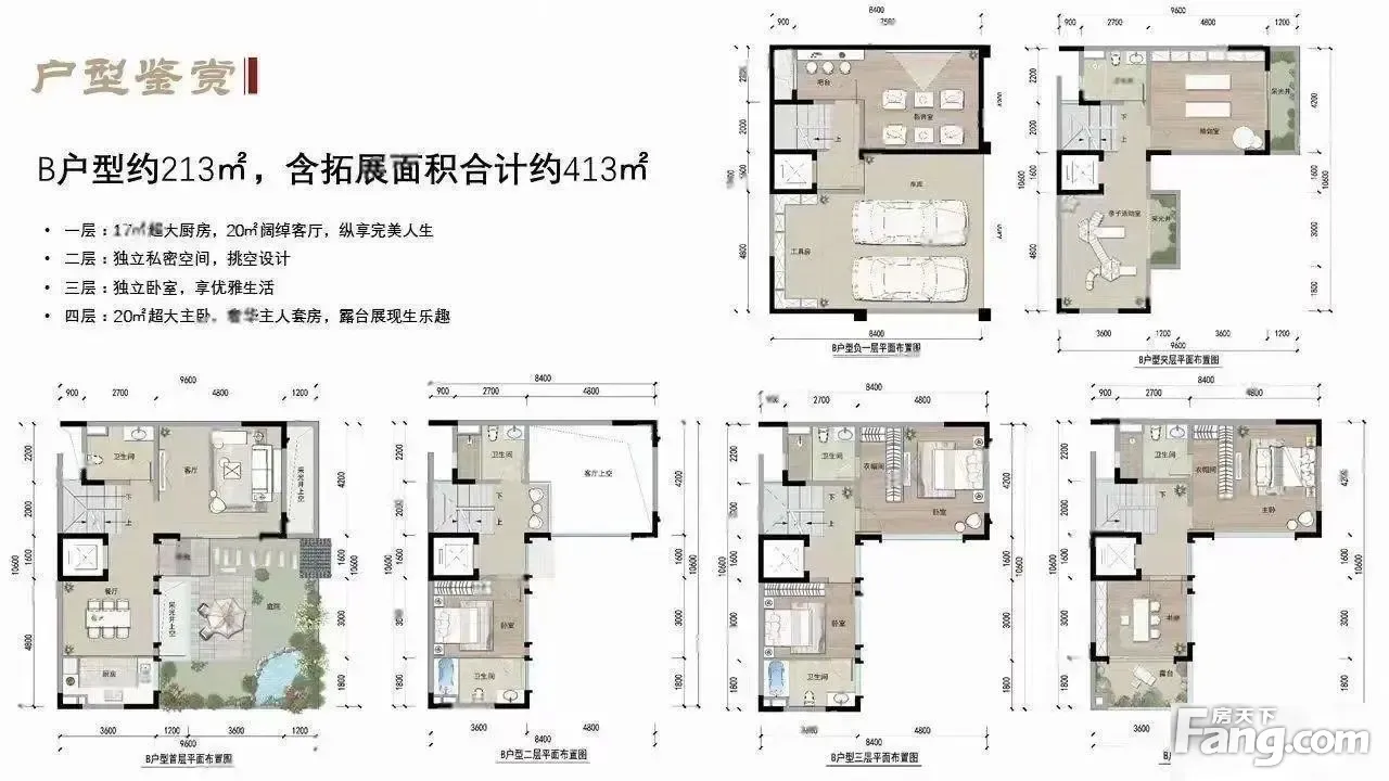 1、产权面积:证上面积304平米,实际实用面积607平。地上四层地下两层 2、花园面积:花园35-65平米。带车库,带露台,送电梯(昆明一家送电梯别墅) 3、单层层高:单层3.3米。 4、户型优势:三面采光,独门独户,带露台,靠滇池,紧邻主城区。3公里内10大生态公园,5大商圈环伺,地铁5号线接驳,中式纯别墅,2600平私人会所。360度全龄段教育。