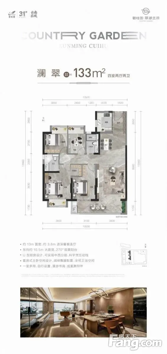 占地面积约:19.1亩 建筑面积约:6.97万㎡ 地块规划:3栋住宅,1栋商业 建筑类型:纯板式小高层 住宅层高:14-20层,公共配套服务用房,地块整体设置2层地下室。 在售:1栋,总高20层,1T2户 千年昆明 繁华从未改变 翠湖是昆明的繁华,是当年昆明的文化、商业、活动中芯,也是昆明城市底蕴与精神 TOP级云系作品 每个城市,一座“云顶,云系产品系的匠造精神和生活理念。昆明城芯翠湖、专业设计团队的力量,四大基因敬献人居理想 一、高科技智慧建造—智能建造机器人、精工四新应用技术 二、板式结构—高端居住艺境,回归邻里社交生活 三、 灰建筑立面— 灰建筑立面,搭配轻盈铝盈铝板线条