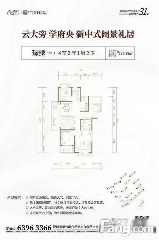 1,百强房企开发,品质保障。 2,绿化45%,楼间距50-70米,保证日照光照。 3.105平三室两厅两卫,户型方正实用,格局好 4.两梯四户板楼,边户采光和视野好,明厨明卫,户型设计合理,每个户型都带阳台,大。 5.小区门口就是云大和西南联大,一边是云南大学,丰富 6.小区门口是云南白药街,到高铁站和地铁站都,交通方便 7.周边有实力锦城小区和天水嘉园小区,配套很完善