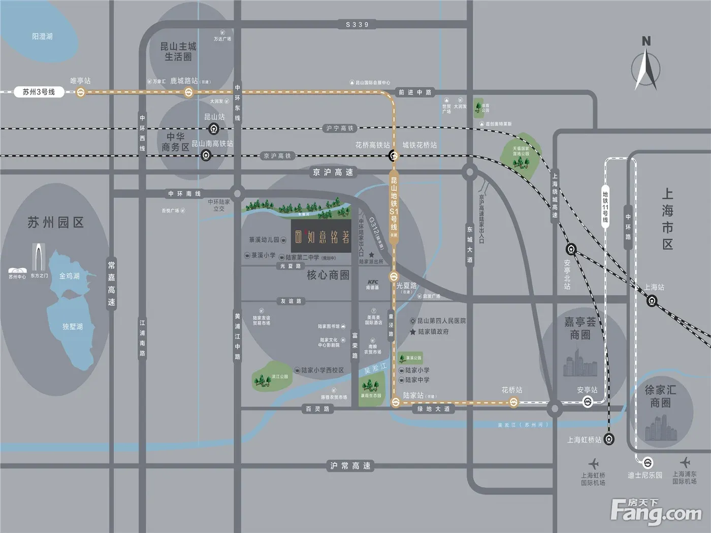 配套纯熟生活无忧 商业配套:启发广场、吾悦广场、世茂广场、首创奥特莱斯、友谊路商业街 医疗配套:昆山第四人民医院 學校配套:菉溪幼兒园、菉溪小學、陆家中學、陆家小學、陆家第學(规划中)
