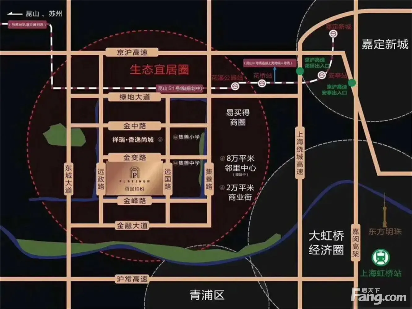交通: 4公里上海地铁11号线花桥站,30可虹桥机场、虹桥火车站,还有建设中的规划 S1号线,延伸至昆山市区、连接苏州和上海,出行便利;医院:东方绿地医院(三级综合),昆山中西结合医院(二级甲),花桥人民医院(二级乙),东方肝胆医院(三级甲),每周坐诊,生活健康,保驾护航。學校:集善幼兒园,集善小學,集善中