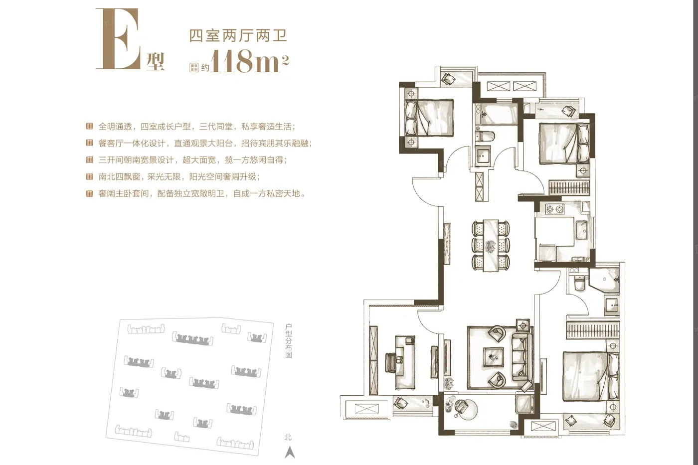 1.【房型正气】格局周正合理、无浪费面积、南北通透 得房率.高! 四房两卫. 小高层 2.【精致装修】精装修交付! 3.【采光充足】楼间距很大、无遮挡、通风好、采光非.常棒! 4.【地段优.势】位于区域繁华地段、交通便利! 5.【配套成熟】小区周边配套特.别完善成熟、附近有银行、医院校区、卖场、菜市场等!
