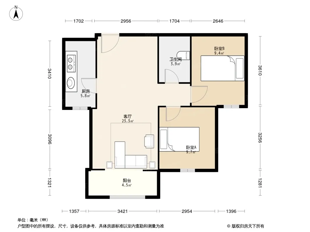 户型齐全,主打户型方正,明厨,客厅朝南,双卧朝南,主卧朝南二居