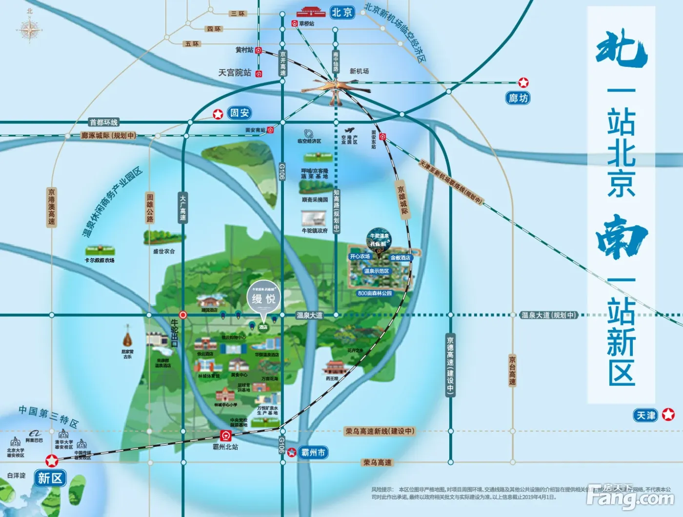 目距新机场约30公里,京雄城际约5公里,近大广高速,106国道、京雄高速、京德高速、荣乌新线高速、京台高速,多条城际、高速线连接北京干道,通达三大核圈,雄安至大兴国际机场R1轻轨年底开通。 6纵:固雄公路、大广高速、106国道、知高路(规划中)、京德高速、京台高速; 3横:廊涿高速、温泉大道(未来规划东延)、荣乌高速新线; 2城际:京雄城际,距离霸州北站约5公里,一站直抵新区,两站即达北京;廊涿城际,规划中; 1轻轨:雄安新区至大兴国际机场R1轻轨落位牛驼,预计年底开通运营,一轨道生活圈,一站新区,一站大兴国际机场。 1班公交:943路公交,便捷出行
