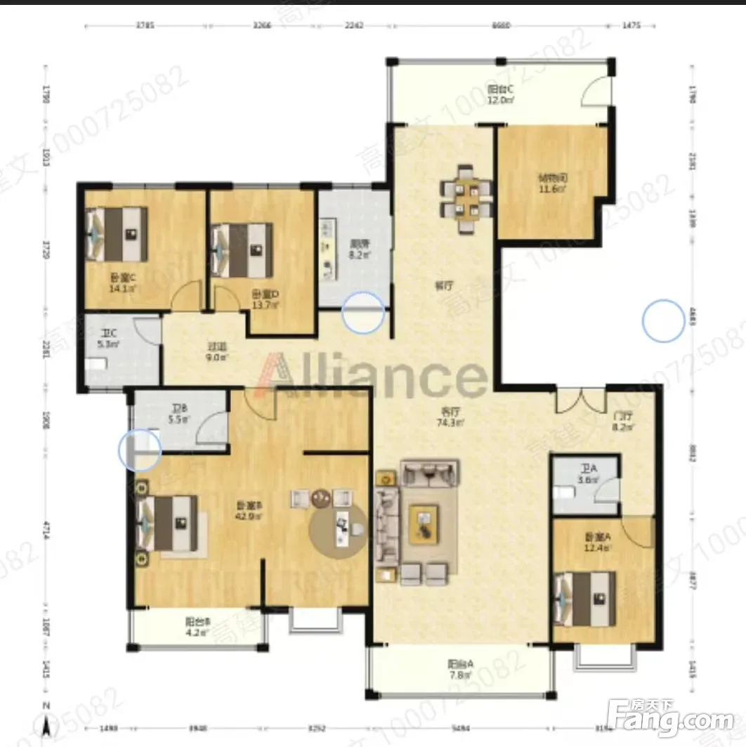 房子南北通透,原来户型是6室2厅4卫,房东家里人少改成5室2厅3卫,客厅4米宽,75平方,餐厅26平,南北双阳台各10平方,餐客厅加阳台120平,非常宽敞,主卧43平,居住品质非常高,中央空调,新风都已经装好