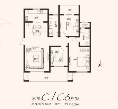 户型齐全,主打露台,南北通透,厨卫不对门,户型方正,客厅朝南,主卧朝南四居