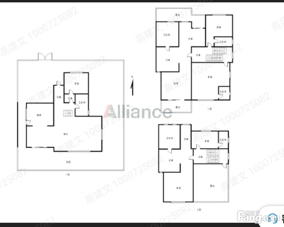 房子一共3 1楼,房子3面花园,北向入户,花园是东南北3面花园,客厅产听朝南,客厅高调控客厅,40平方左右,餐厅30多平方,厨房,15平方左右朝西,次卧朝北,卫生间朝东。 2楼,2卧朝南,2卧朝北卫生间朝北,北向一个阳台一个露台,南向卧室带一个阳台, 3楼,1卧朝南,楼台朝南,1卧朝北,书房朝北,卫生间朝北