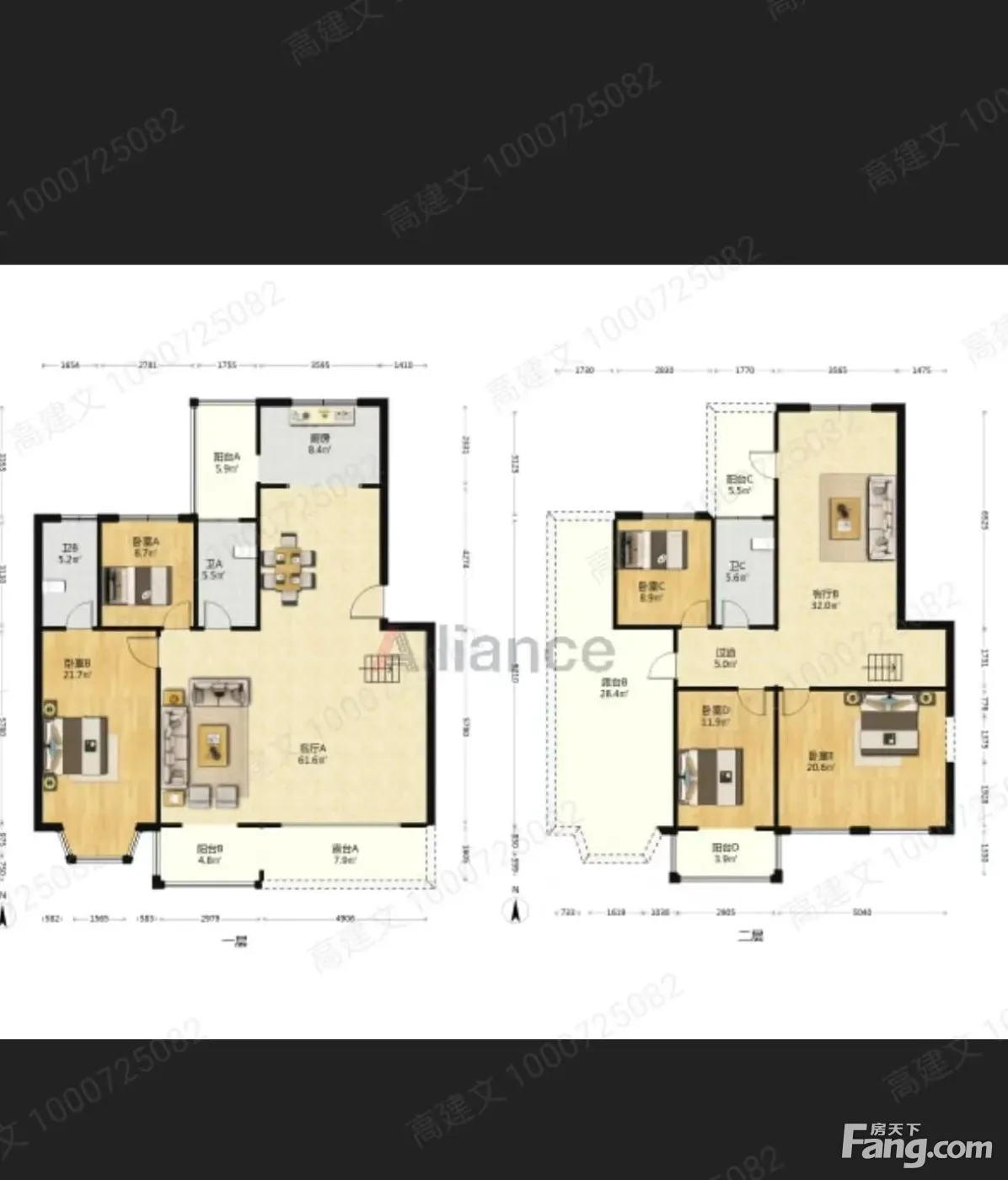 房子上下2层 1楼客厅朝南宽8米,62平,住卧朝南22平带独立卫生间,次卧朝北,餐厅朝北,厨房朝北北边一个阳台,南边一个阳台,露台在南边 2楼客厅朝北,32平,2卧朝南.1卧朝北.卫生间朝北,南边一个阳台,北边一个阳台,露台朝西