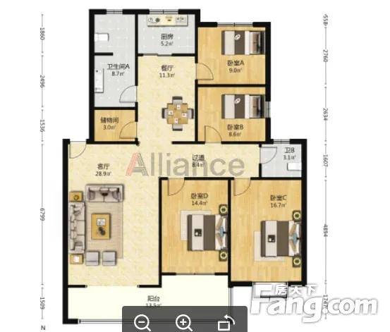 户型齐全,主打户型方正,明厨,客厅朝南,主卧朝南三居