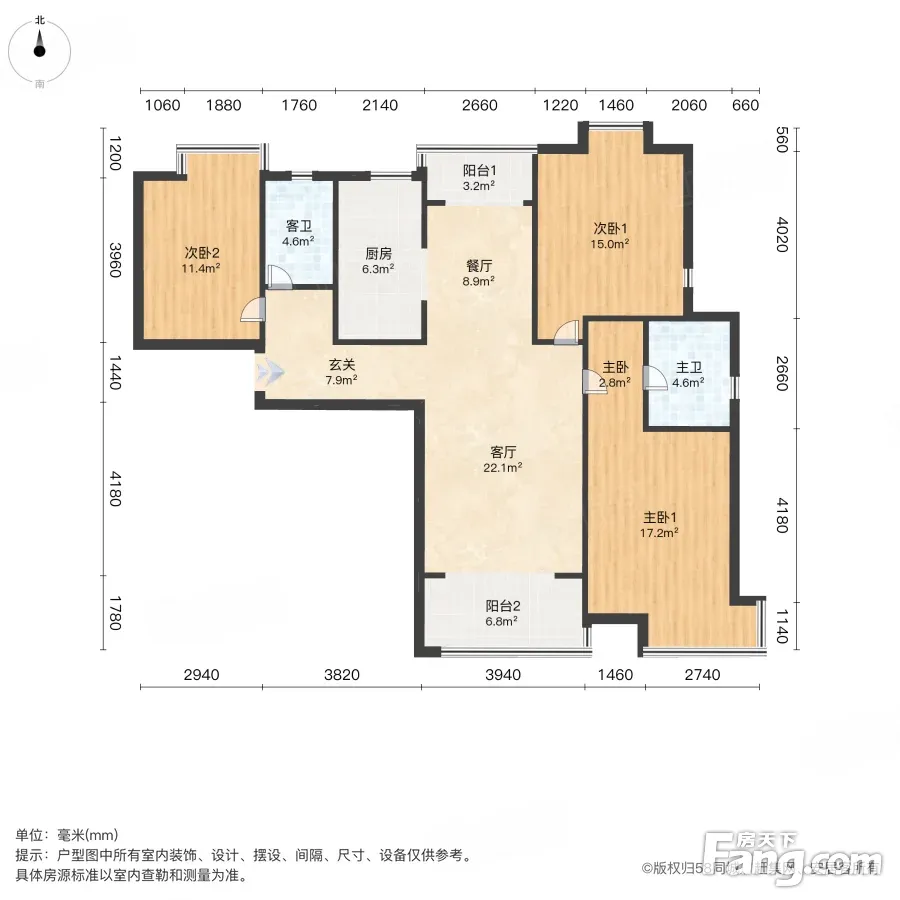 户型齐全,主打户型方正,独立衣帽间,明厨,客厅朝南,主卧朝南三居