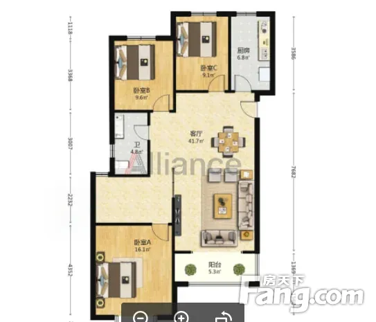 户型齐全,主打户型方正,明卫,明厨,主卧朝南三居