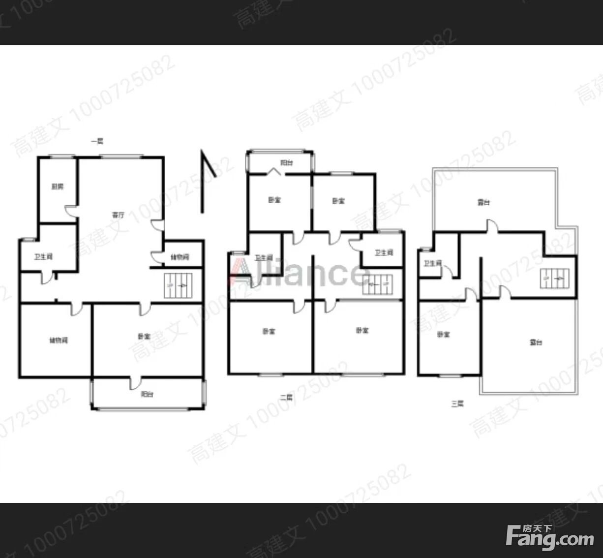房子上下3层, 1层,2卧朝南,客厅朝北,厨房朝北,阳台朝北 2楼,客厅朝南,主卧朝南,2卧朝北,卫生间朝北 3楼,1卧朝南,卫生间朝北,南露台30平,北露台30平