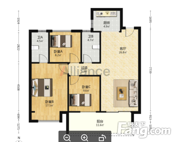 房子是2022年交房 户型无改动 三室 通阳台户型,朝南户,采光面更大