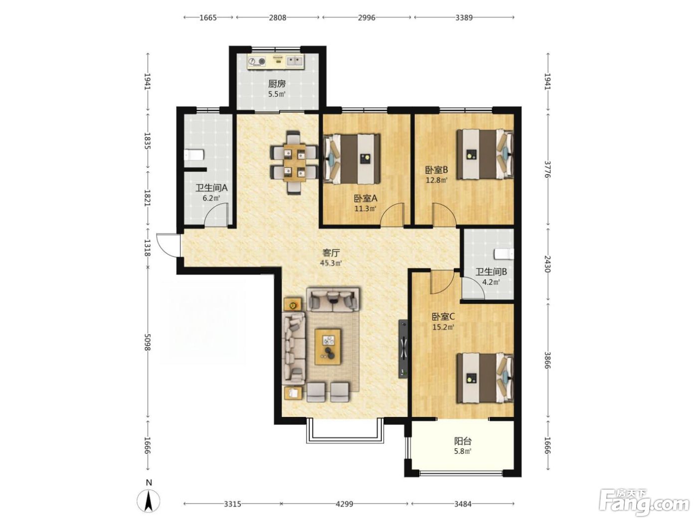 户型齐全,主打南北通透,主卧带卫,客厅朝南,主卧朝南,观景飘窗,全明格局,餐客分离,卧室带阳台三居