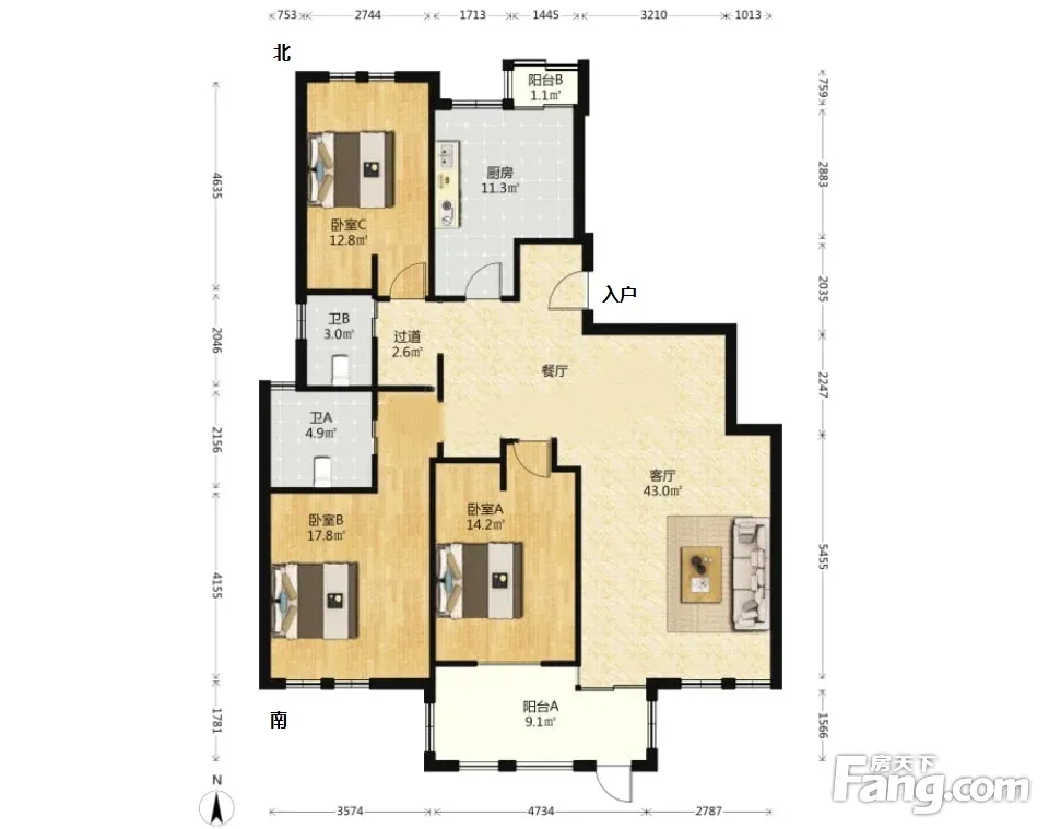 户型齐全,主打户型方正,明厨,客厅朝南,双阳台三居