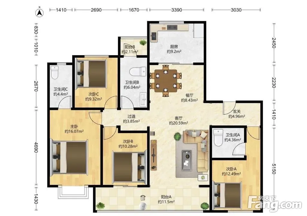 户型齐全,主打南北通透,客厅朝南四居