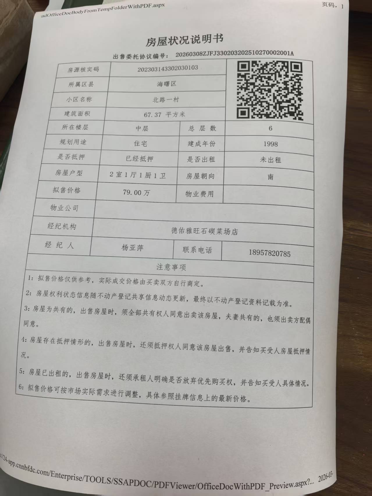 北路一村2室2厅1卫南朝向79.0万元/套出售