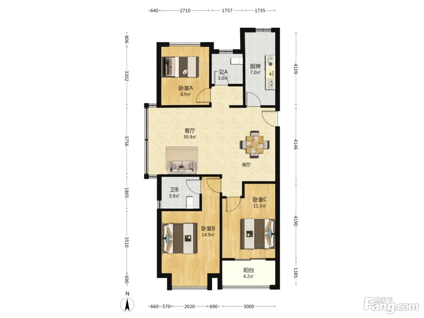 户型齐全,主打户型方正,明卫,明厨,客厅朝南,主卧朝南三居