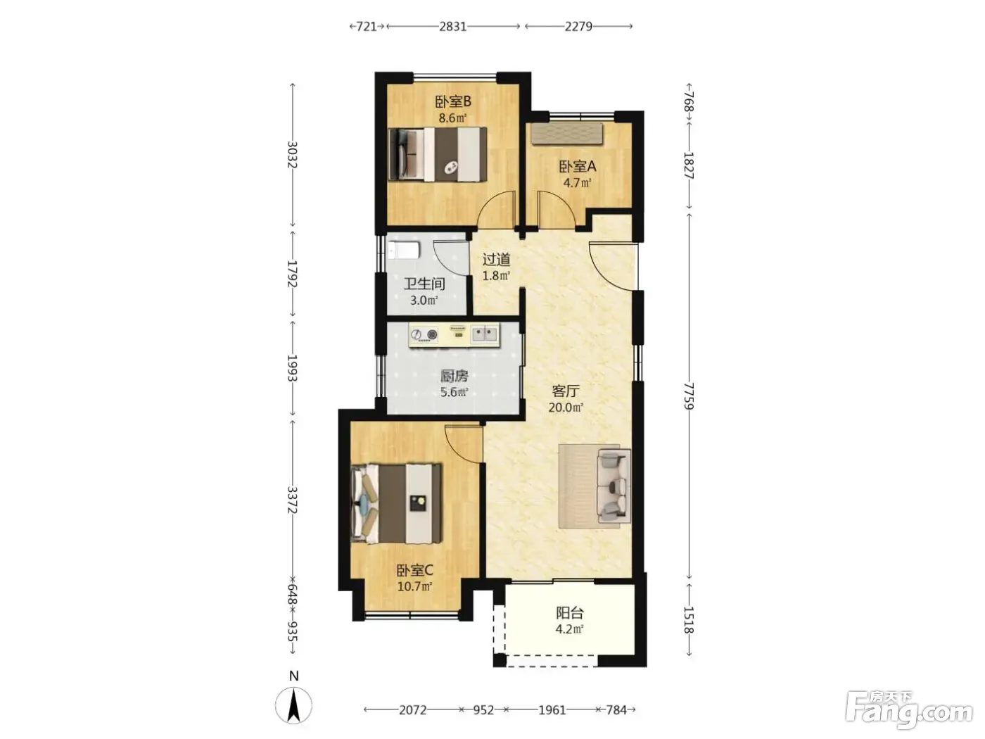 户型齐全,主打客厅朝南,卧室朝南三居