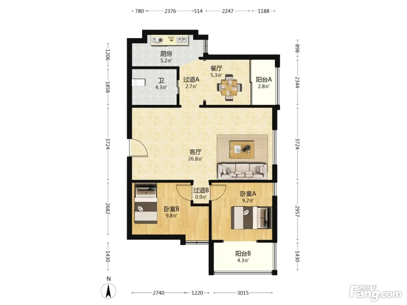 户型齐全,主打明卫,明厨,客厅朝南,主卧朝南二居