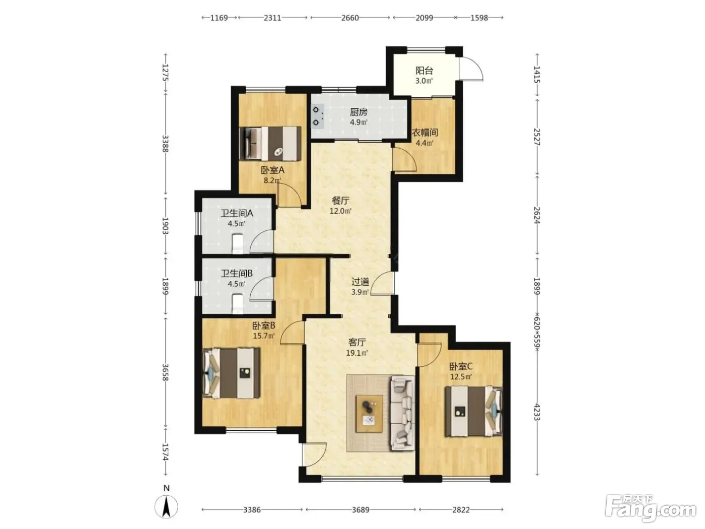 户型齐全,主打南北通透,户型方正,卧室朝南三居