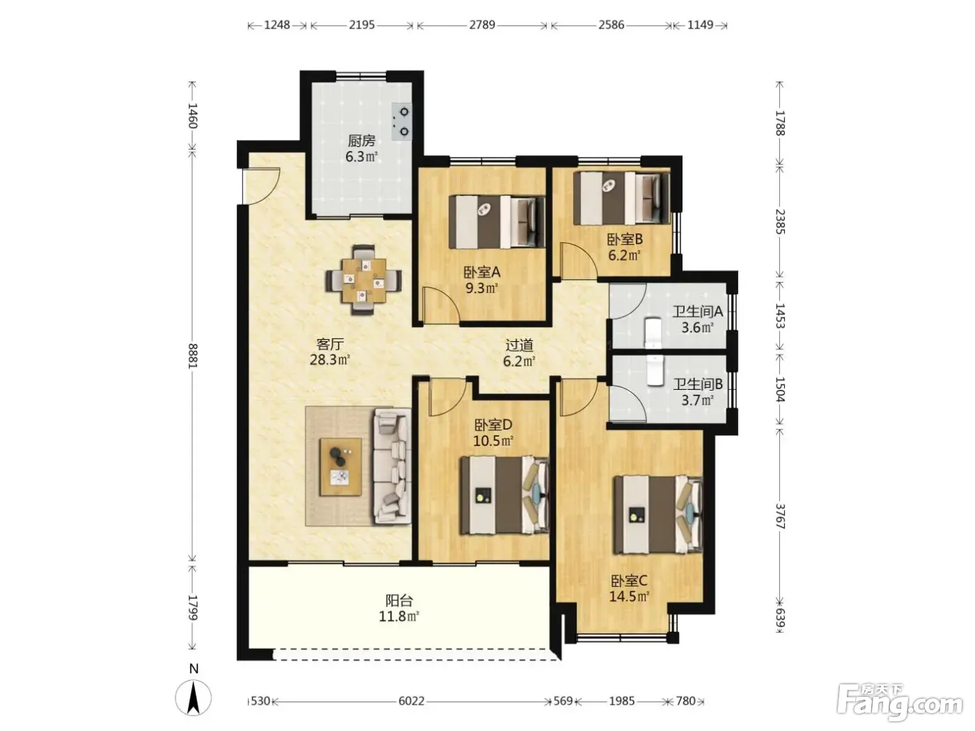 户型齐全,主打南北通透,客厅朝南,U型厨房四居