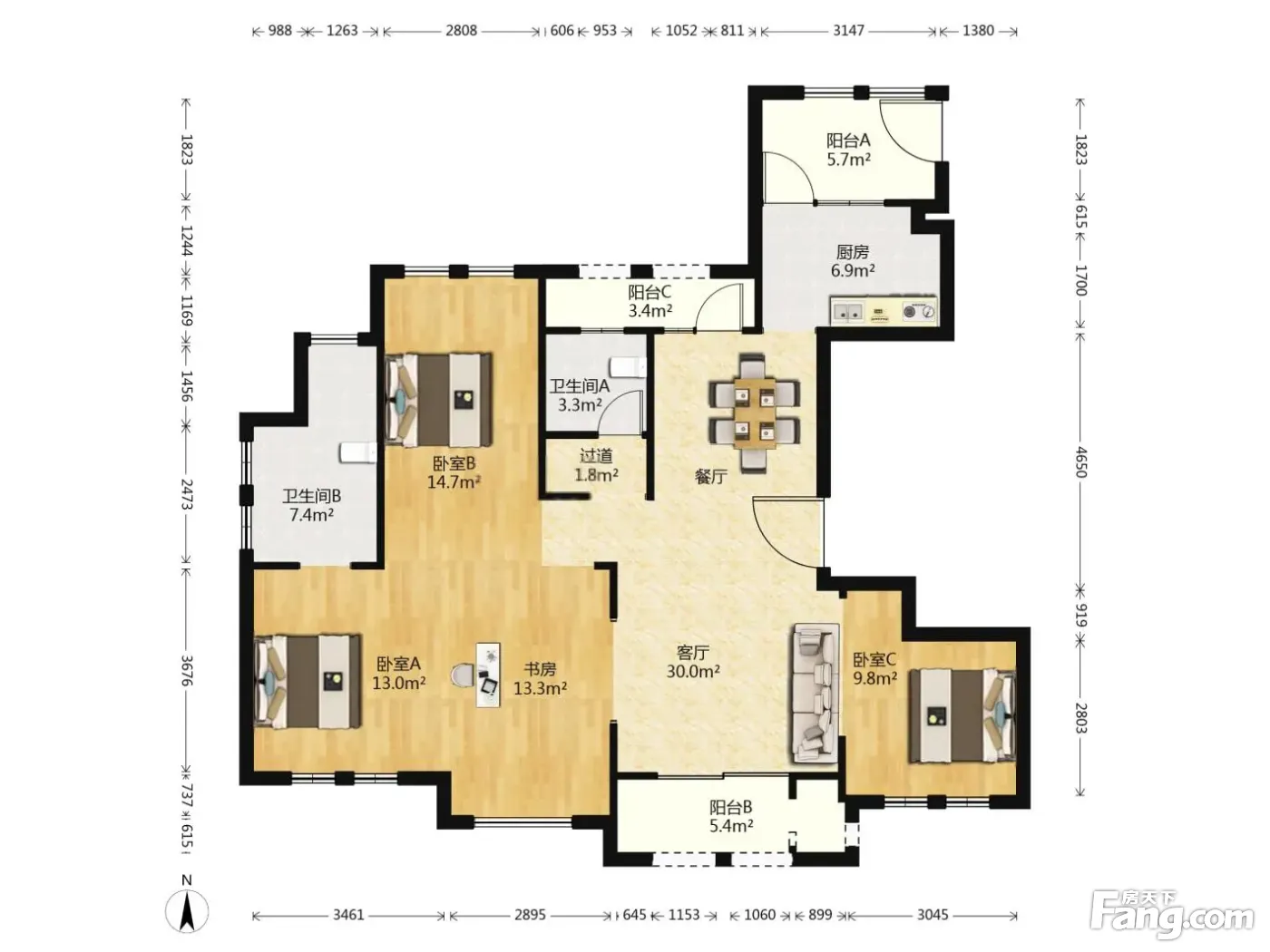 户型齐全,主打户型方正,明卫,明厨,双卧朝南,主卧朝南四居