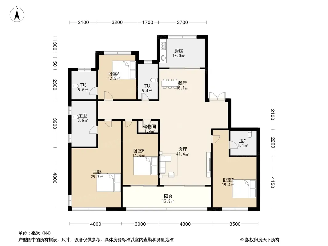 户型方正,采光良好,通风透气,坐北朝南,客厅卧室分布合理,得房率较高!