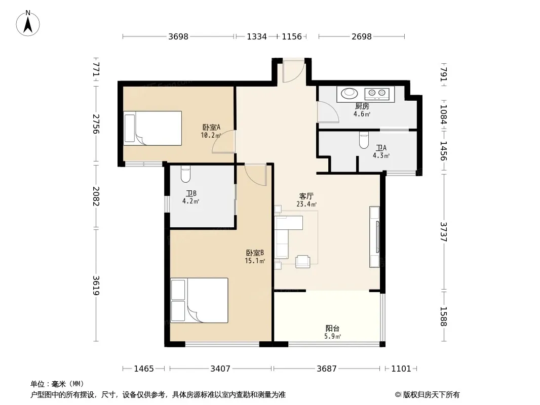 户型齐全,主打户型方正,明厨,独立衣帽间,明卫,客厅朝南,双阳台三居