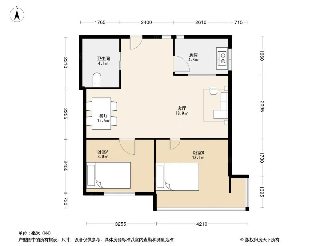 户型齐全,主打户型方正,明厨,主卧朝南二居