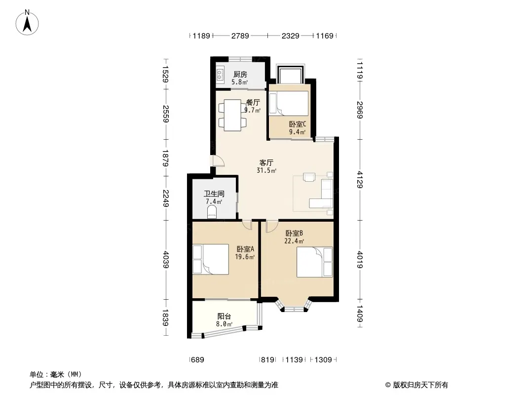 户型齐全,主打户型方正,明卫,明厨,客厅朝南,主卧朝南三居