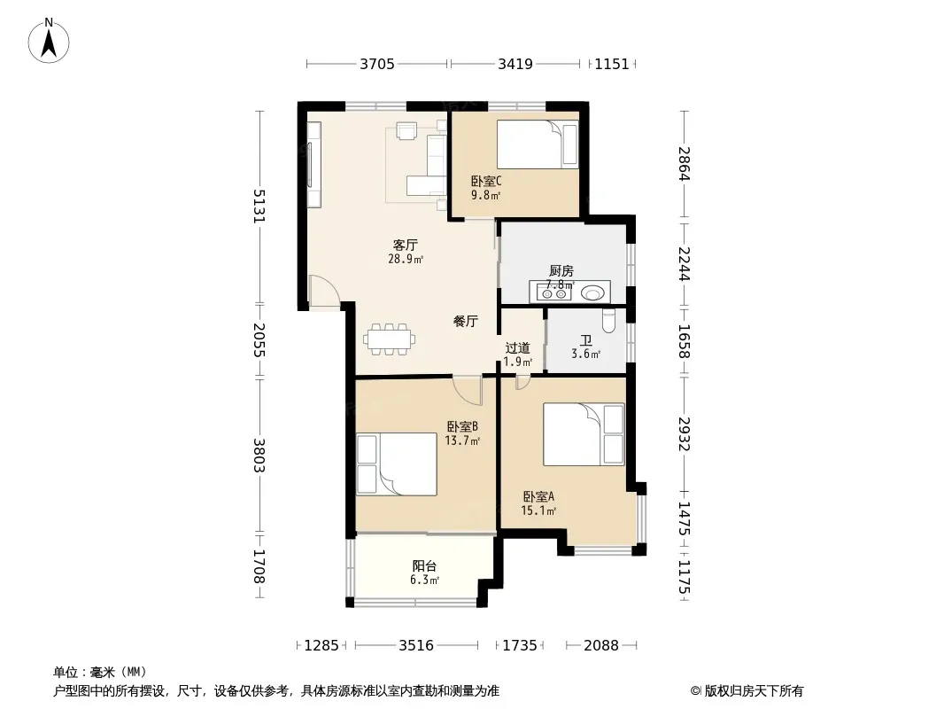 户型齐全,主打户型方正,明卫,明厨,客厅朝南,全明格局,双卧朝南三居