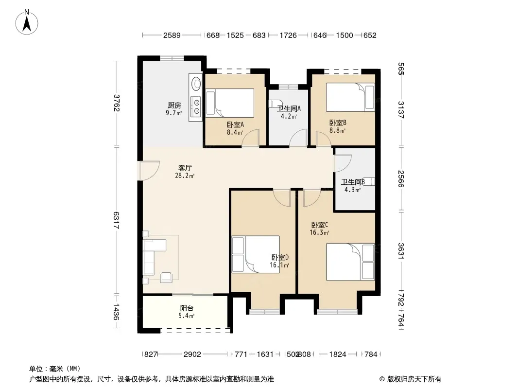户型齐全,主打户型方正,明卫,明厨,客厅朝南,双阳台三居