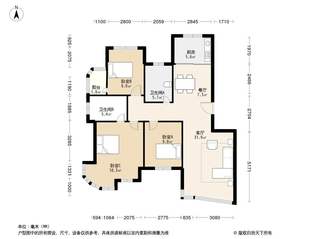 户型齐全,主打户型方正,明卫,明厨,主卧朝南三居
