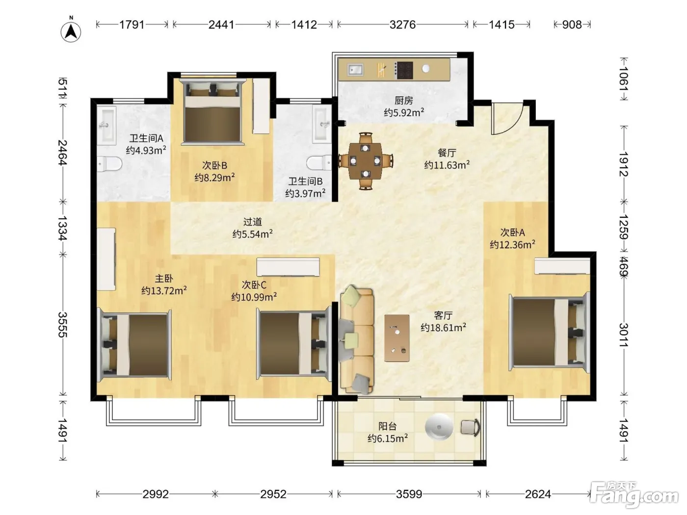 户型齐全,主打户型方正,明卫,明厨,客厅朝南,全明格局,双阳台,双卧朝南三居