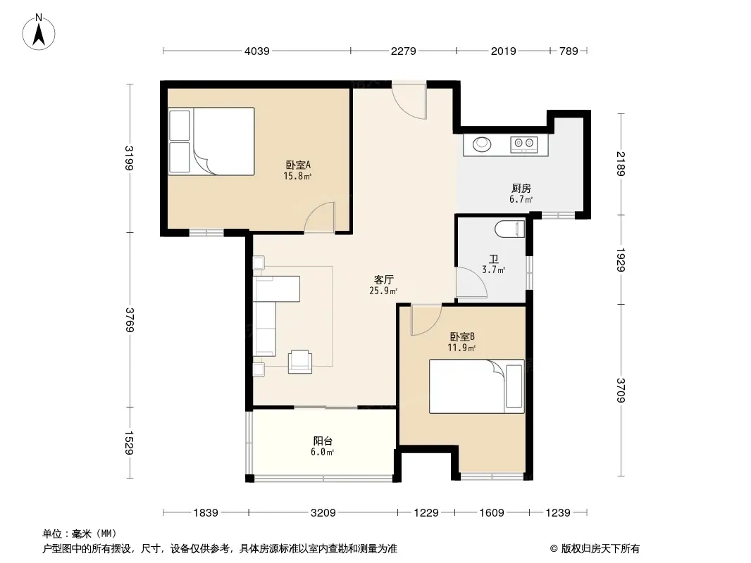 户型齐全,主打户型方正,明卫,明厨,主卧朝南二居